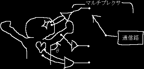 今日の電子回路はマルチプレクサ (多重化器) に関する講義だったんですけど,そこで先生が使用例の絵を描きました.「例えば人間の脳波や脈拍を測るとする.これを同一の通信路に流すために…」とか言いながら描いた絵がコレ.万歳した状態の人の頭部から脳波を,腕から筋電を,胸から心拍を測る様子だと思われるんですが,何だか凄くありませんか? 何かが間違っているような気がするなぁと.因みに,頭部は光っているわけじゃなく,アレでシナプスを示しております.マッハ溜まっていきます