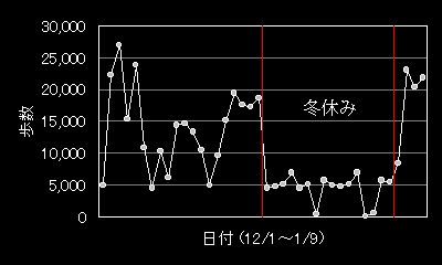 何となく,ここ最近のその日その日の歩数をグラフ化してみました.一番左のデータが昨年12月1日の5,011歩で,一番右のデータが昨日の21,808歩です.新聞配達のバイト (約5,000歩) が毎週金曜に休みになることと,登下校 (片道約8,000歩) が毎週土日に無いことを考えると,7日周期のリズムとなるんですが,グラフにもそれが若干現れていると思います.それにしても冬休みだけガクンと下がりましたね.特に新聞配達の無い日なんかは,殆んど歩いていません.歩数が最も少なかったのは,新聞休刊日の1月2日の174歩です.ハハハ…,こんな休みだったために,学校始まってすぐの最近が辛いわけで.ワープロ