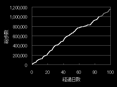 10月24日から昨日までの総歩数が遂に1,000,000歩を超えました.これもひとえに皆様のお陰です(んなこたぁない).で,お決まりのグラフ化してみたんですが,やはり7日周期で増加具合が違いますね.綺麗な波が見られます.冬休み期間(59日目〜74日目)はこりゃまた平らな感じで.因みに,87日目以降の灰色のラインは予測値です.予測値の導出式ですが,10月24日に考えついたそれでは7日周期という制限が弱かったので,1週間前×0.4 + 2週間前×0.3 + 3週間前×0.2 + 前日×0.05 としました.manpo計で計測しないと徐々に予測歩数が淘汰するのがミソですな.こうすることで,manpo計の着用を忘れないようにしよう…と.土日は多忙の人