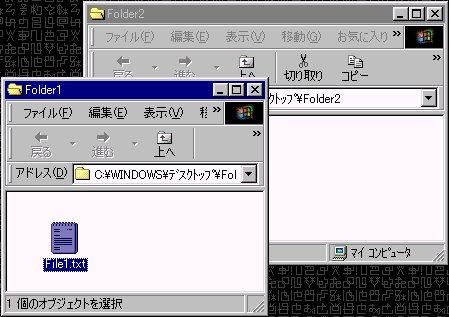それと,それなりにWindowsを使っている人達にとっては思いもつかないことをやってくれたので,その点では楽しめました.ファイルやフォルダのコピーの方法として,コピー対象を選択した後にウィンドウ上のコピーボタンを押す方法を教えたのですが,下図のような状態でFile1.txtをコピーしようとして,アクティブになっていないFolder2のウィンドウ上のコピーボタンを押してくれたのです.その瞬間,なるほどと.そして,ごちそうさまでしたと.も〜っと!おジャ魔女どれみ (12日目)