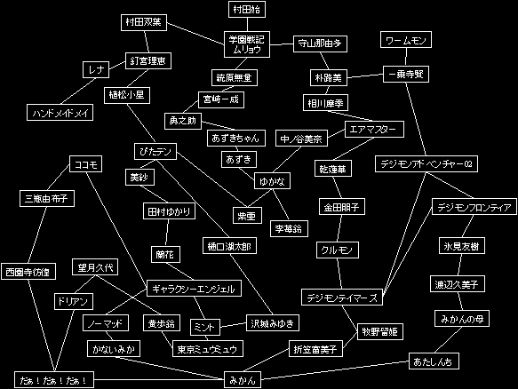 昨日の日記に載せた脳内ネットワーク図ですが,まだまだ不備があったなと.もっと色んなパスで相互接続可能だった場所があったなと.GAからデジキャラット経由でだぁ×3とか,釘宮理恵氏からデビチル経由でゆかな氏とか,デビチルから氷上恭子氏経由でハンドメイドメイやデジキャラットとか,あずきちゃんからCCさくら経由でデジアドとか,あたしンちから阪口大輔氏経由で東京ミュウミュウとか,ゆかな氏からだぁ×3とか,とにかく色々….@M岡研究室