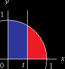 下図の青い部分の面積と赤い部分の面積が同じになるように分断する線の式を求めたくなりました.もちろん仕事としてですよ.問題を簡単化するために,4分の1の単位円としてみました.単位円は「x2 + y2 = 1」で表すことができ,4分の1の単位円の面積は「π/4」で,青い部分と赤い部分の面積が等しいことから,以下の式をtについて解けば良いのかなと考えました. →