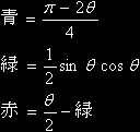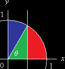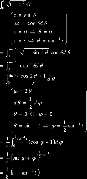 高専の2年生か3年生の頃に解いた記憶のある積分の式が登場しました.はて,「x = sinθ」として置換積分するんだったかしら.それとも丸ごとfと置いて部分積分か.残念ながら今の私には積分パワーが足りないようです.つーわけで,別の解法を模索しました.おや,補助線を引いたら簡単そう. 「青 + 緑 = 赤」として,θについて解けば良いのでは.しかしこっちもなかなか. ![]()